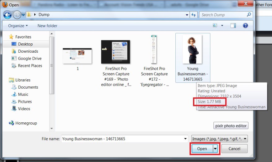 3. Navigate to where you have the image saved on your computer. Once you have selected the image, click “Open.” As you can see in the example below, the image is close to 2 MB. It’s best to load only pictures that are well less than a MB onto your site; in fact, most pictures should be 100 KB or less.