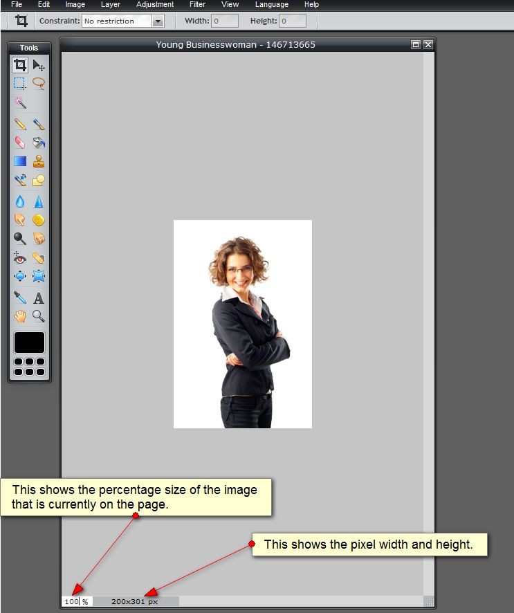 6. In our example, we’ve changed the width to 200 pixels, and the height adjusted automatically. To see how large your adjusted picture will appear on your website, make sure that the percentage in the lower left hand corner is 100%.