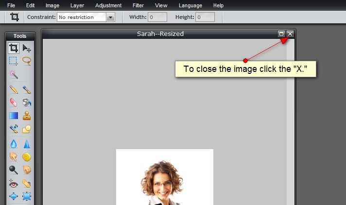 10. To close the original image, click the “X.” When it asks if you want to save the image before closing, click “No”. This will keep your original photo at its original resolution in case you need a higher resolution photo in the future.